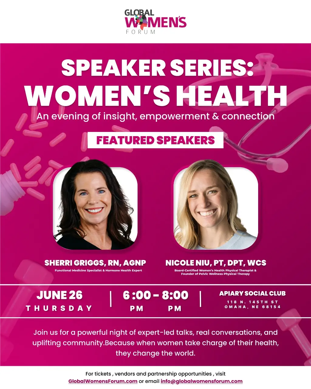 We are excited to host the Global Women's Speakers Series with the first series focused on women's health. We are honored to feature: Sherri Griggs, APRN, MSN Functional Medicine Specialist & Hormone Health Expert and Nicole Niu, PT, DPT, WCS, Board Certified Women's Health Physical Therapist & Founder of Pelvic Wellness Physical Therapy. Expect inspiring, expect led-talks and meaningful conversations around women's health at Apiary Social Club.